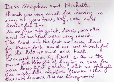 Really enjoyed every minute of my Stay. Michelle and Steven are great owners. Ask Steven about his Fawlty towers experience: brilliant. The Chef knows his eggs. Super breakfast. Quitiest room ever with best view and super bed. Would definitely come back. Excellent base for whale watching in the area which I did with great results. ( D.J. - The Netherlands)