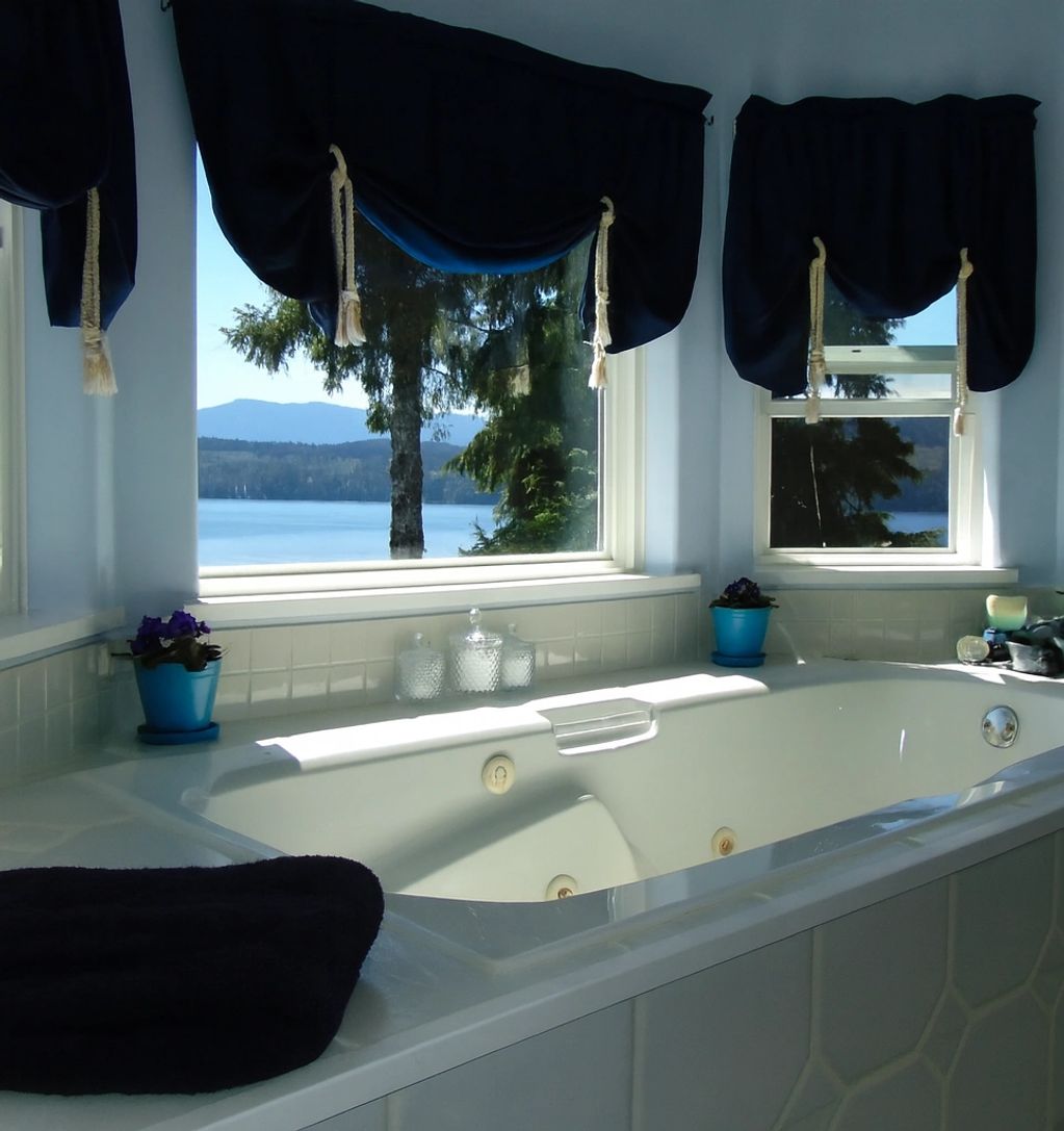 A restful queen bed overlooks the shimmering bay — the perfect place to wake to the soft light of morning or drift to sleep to the hush of the tide. The private bath offers both a soothing bathtub and a refreshing shower, with soft robes and a blow dryer provided for your comfort. Every detail is designed to bring ease and quiet pleasure to your stay by the sea.
