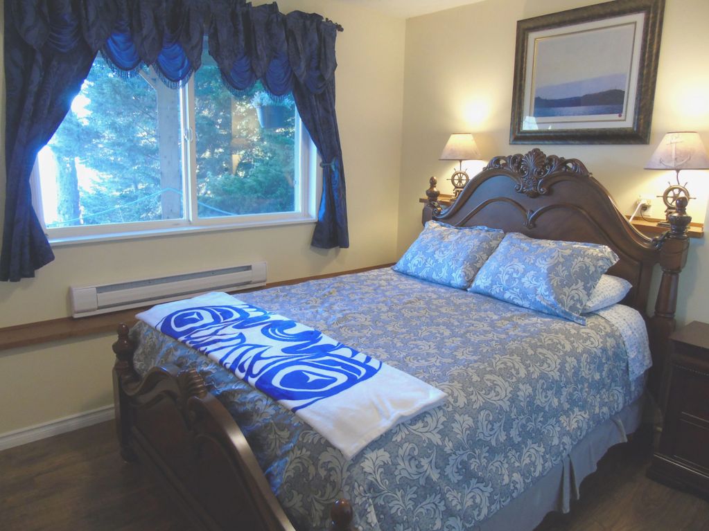 The Whale Watcher invites you to rest and dream beside the sea. This serene queen room opens to a private deck overlooking Stephens Bay — a front-row seat to nature’s quiet spectacle. Watch whales glide through silver waters, eagles trace wide circles in the sky, and the evening light dance upon the waves. With a glass of wine in hand and the scent of salt air all around, you may find yourself