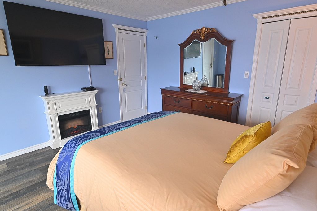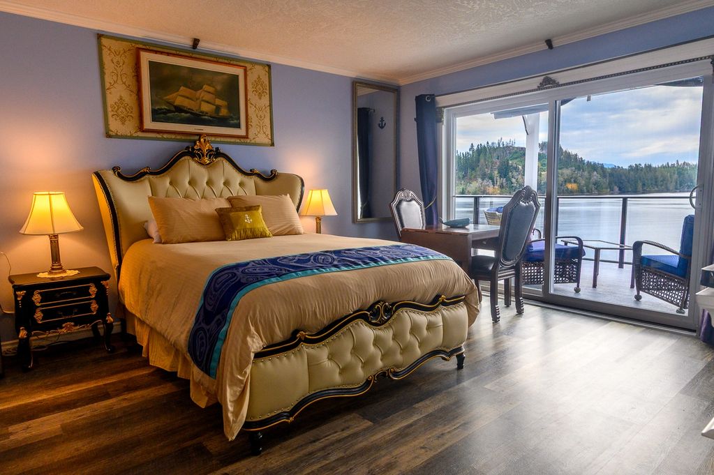 Queen size bed with a beautiful view of the bay. The suite has its own private bath with bathtub and shower. Robes, blow dryer available in the bath.